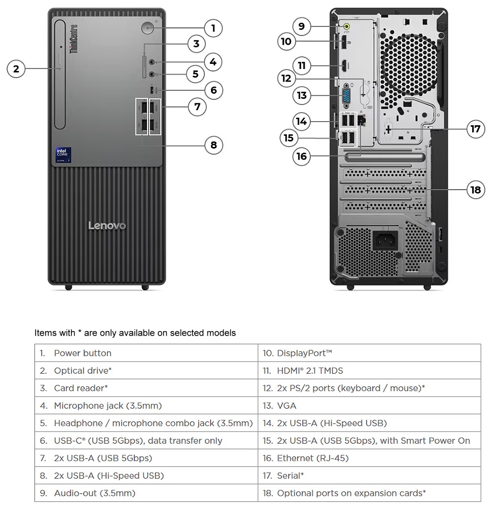 Vorne, hinten, überall: Der ThinkCentre neo 50t Gen 6 bringt dir jede Menge Ports mit. HDMI, DisplayPort, VGA, USB-C, USB-A (mehrfach), Ethernet, Audioanschlüsse und sogar PS/2 für Legacy-Hardware.